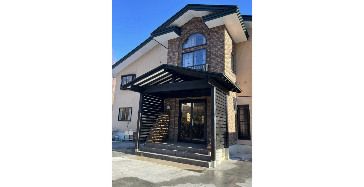 大きく張り出した屋根です。外の階段も覆う広さです。大雪の日に大荷物があっても出入りに困りません。